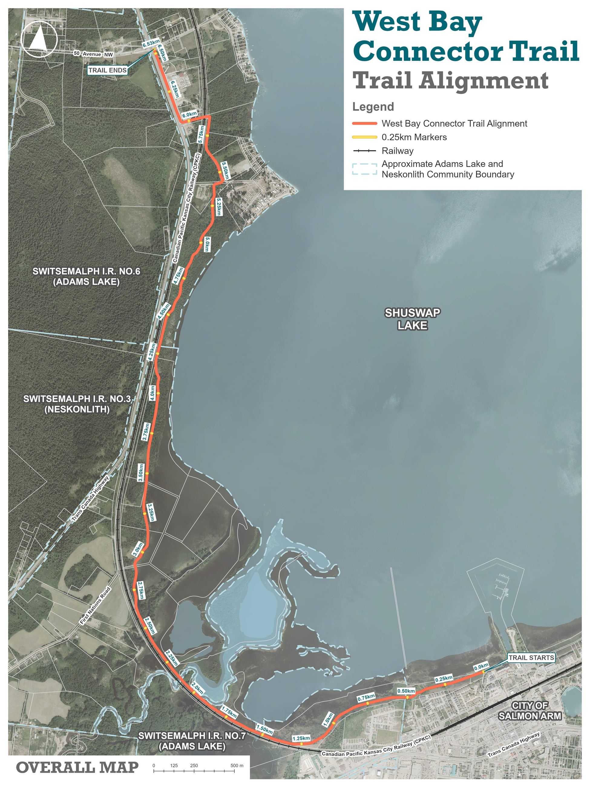 When completed the proposed 6.5 km trail will extend from the existing Salmon Arm Wharf boardwalk through Neskonlith and Adams Lake Communities to the northern edge of the Adams Lake Community (Switsemalph No. 6) ending near Pierres Point Road (50 Ave NW). The preliminary design intends to honour and incorporate Neskonlith and Adam Lake traditional knowledge and connection to the land with technical insight including heritage/archeological, environmental, engagement, trail design, landscape, active transportation, structural engineering, and safety.